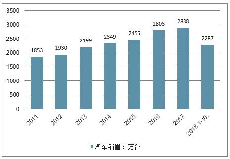 随着人民生活水平的提高,人均可支配收入的增加,汽车逐渐成为大多数家庭必备的交通工具。,2011-2017年,我国汽车销量屡创新高,其中,2017年,我国汽车总体销量为2888万台,同比增长3.03%。截止至2019年10月底,我国汽车销量为2287万台。