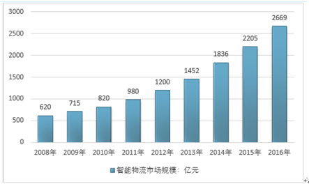 2008-2016年我国智能物流系统市场规模(单位:亿元)