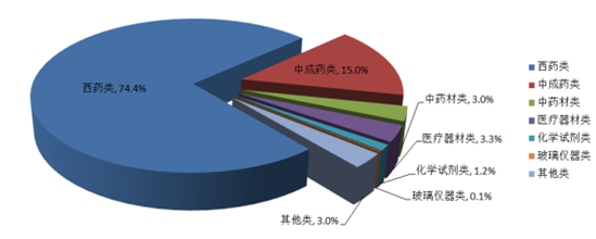 按销售品类分类,西药类(西药类包括化学药品制剂、化学原料药及其制剂、放射性药品、血清疫苗、血液制品和诊断药品等,但不包括化学试剂等)销售居主导地位,销售额占七大类医药商品销售总额的74.4%,其次为中成药类占15.0%,中药材类占3.0%,医疗器材类占3.3%,化学试剂类占1.2%,玻璃仪器类占0.1%,其他类占3.0%。