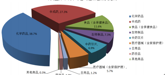 据中国医药商业协会典型样本城市零售药店2016年品类销售统计,零售药店销售额中的药品类居主导地位,占零售总额的80.2%,其中西药占46.0%(化学药品占38.7%、生物制品占7.3%)、中成药占27.3%、中药饮片占6.9%;非药品销售占19.8%,其中食品(含保健食品)占11.6%,医疗器械(含家庭护理)占5.7%,而药妆品、日用品和其他商品这三类总占比不足3.0%。