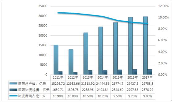 2011-2018年中国医药总产值及医药物流市场规模情况
