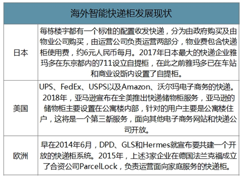 海外智能快递柜的覆盖率普遍较高。德国DHL旗下自助化包裹邮寄站(Packstation)已覆盖德国90%人口;日本每栋楼宇均设置收发快递柜;在美国,BufferBox服务范围广泛,2018年电商巨头亚马逊宣布在全美推出快递储物柜服务。