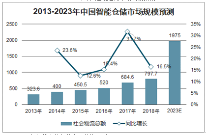 中国物流业的快速发展为仓储业的崛起提供了巨大的市场需求,加上制造业、商贸流通业外包需求的释放和政策的引导,智能仓储的战略地位将持续加强,未来智能仓储市场需求将进一步释放,预测到2023年,智能仓储市场规模将达1975亿元。