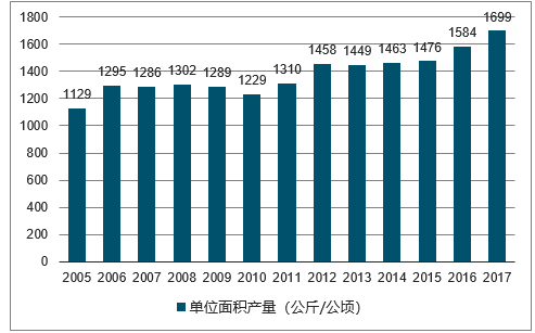 2005-2018年中国棉花单产面积走势图