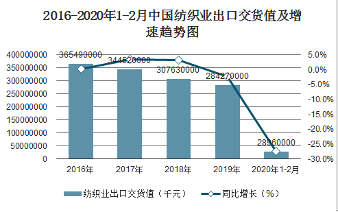 2016-2020年1-2月中国纺织业出口交货值及增速趋势图