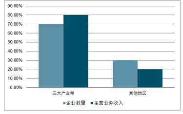 从百强企业分布来看,珠三角、长三角、环渤海三大产业带聚集了70%的企业,这些企业的主营收入更是占到80%,区域发展不均衡可见一斑。