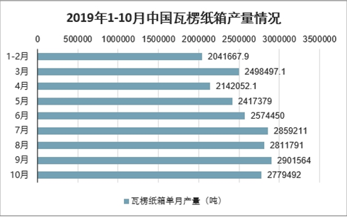 2019年10月中国瓦楞纸箱产量为2779492吨,同比下降1.7%;2019年1-10月中国瓦楞纸箱产量为27017528吨,同比下降0.9%。
