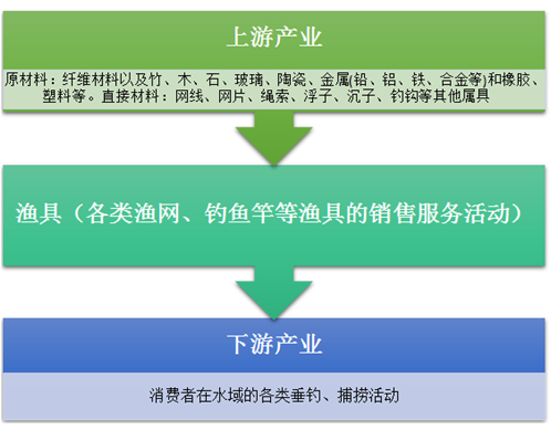 渔具行业上游市场一般指可直接用来构成渔具的网线、网片、绳索、浮子、沉子、钓钩等其他属具,广义而言还包括制作以上各种材料的原材料,主要有纤维材料以及竹、木、石、玻璃、陶瓷、金属(铅、铝、铁、合金等)和橡胶、塑料等;中游市场主要指各类渔具市场,包括各类渔网、钓鱼竿等渔具的销售服务活动;下游市场主要是指渔具的应用范围,主要包括消费者在水域的各类垂钓、捕捞活动。