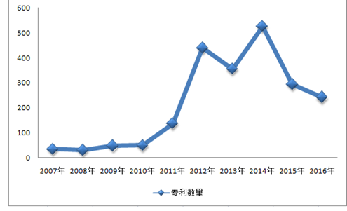 2007年以来,我国对渔具行业的专利申请数量成上升趋势,在2014年达到峰值,共申请了526个。2016年,我国渔具专利申请数为241个。
