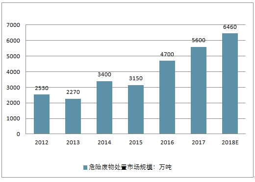 中国危险废物处置量从2012年的2530万吨增至2016年的4700万吨,年均复合增长率为13.1%。随着十三五期间中国鼓励越来越多处理设施开展积存及新产生危险废物处理,中国危废处理市场规模将不断扩大,预计2019年中国危险废物处置市场规模将超6000万吨。