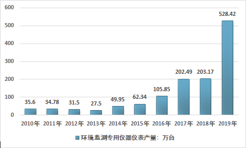 近几年,我国环保监测仪器行业产量快速增长,从2010年的35.6万台增长到了2019年的528.42万台。近几年我国环保监测仪器行业产量情况如下图所示: