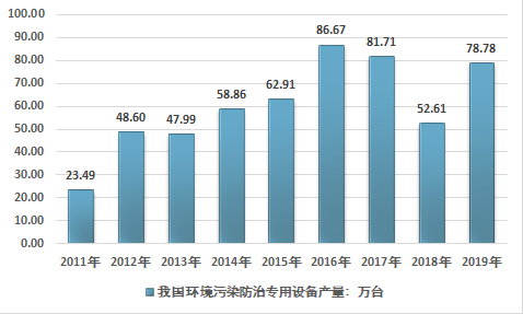 随着国家对环保的日益重视,近年来我国环境污染防治专用设备产量呈现上升趋势,2016年产量达高产量86.67万台,2016-2018年我国环境污染防治专用设备产量有所下滑,2018年为52.61万台,同比2017年减少了29.11万台,2019年产量回升至79.78万台。