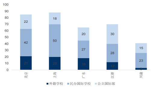 从地域分析,北京上海等较发达地区,对 于国际学校的需求较高,同时北京和上海的家长消费力较强,对于比公办国际班贵 N 倍的 民办国际学校接受度比其他地区更高,两个地方国际学校的入学门槛较高。根据新学说传 媒的数据,截至到 2015 年,上海拥有 88 所国际学校位居第一,北京、广东分别拥有 85、 65 所国际学校,位居二、三位。广东两湖的公办和民营学校数量约略相等,显示对于民办 国际学校的需求较北京和上海为少。东三省以公立国际班为主,显示家长对于公立教育体 系较有信心,同时也可能反映了消费力的落差。