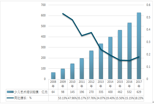 2018年,我国少儿艺术培训行业市场规模在629亿元左右。目前我国2-12岁少儿超过2.2亿,基数庞大,少儿教育面临前所未有的发展空间,预计我国每年参加各类艺术培训的青少年儿童将超过1亿人次。