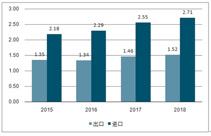 2015-2018年中国显微镜进出口金额情况及预测(亿美元)