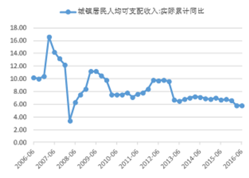 2006-2016年中国居民收入增速再下台阶
