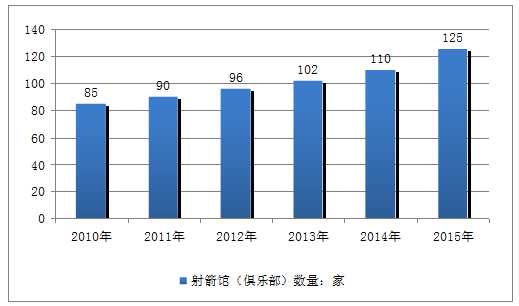 2010-2015年中国射箭馆、射箭俱乐部数量增长趋势