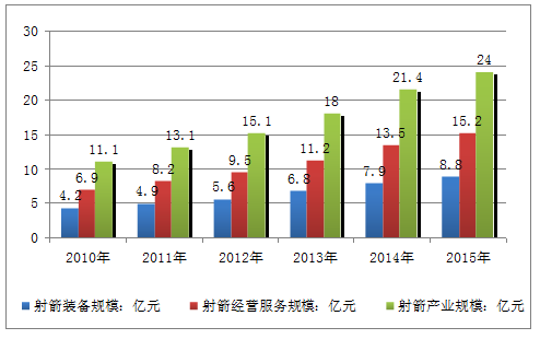 2015年我国射箭产业规模约24亿元,其中射箭装备规模约8.8亿元,射箭经营服务市场规模约15.2亿元。近几年我国射箭产业规模呈现快速增长态势,如下图所示: