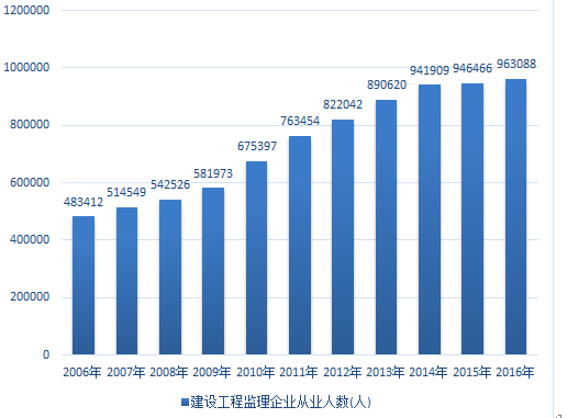 根据国家统计局的统计数据,截至 2015 年底,我国建设工程监理行业在册从业人员共 94.58 万人,其中,在行业协会注册的执业人员 22.33 万人,占从业人员总数的 23.61%。2005 年至 2015 年期间,我国建设工程监理行业从业人员数量变动情况如下: