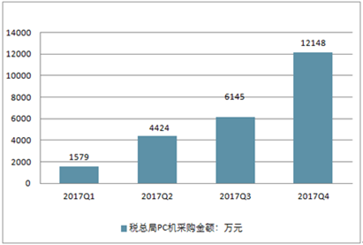 2018年国税总局PC机采购呈现逐渐上升的趋势,在四季度达到12148万元。