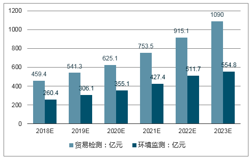 预计到2023年我国第三方检测产业规模将增长至2805亿元,其中贸易检测领域规模将达到1090.0亿元,环境检测领域规模将增长至554.8亿元。