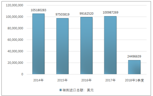 2016年我国碳刷进口总额99162520美元,2017年进口总额100987269美元;2019年1季度进口总额24496639美元。