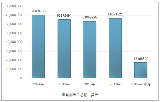 2016年我国碳刷出口总额63068996美元,2017年出口总额66571521美元;2019年1季度出口总额17168520美元。