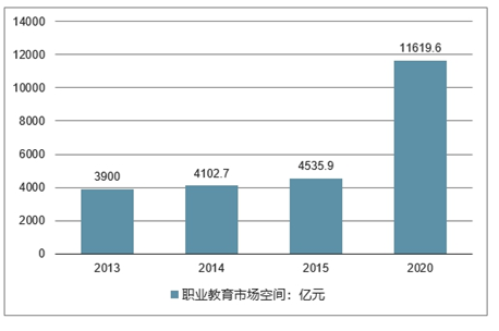 2015年我国职业教育市场空间为4536亿元,预计2020年将达到11620亿元,五年复合增速达17.15%。其中,学历职业教育市场规模为1430亿元,预计2020年将达到1761亿元,五年复合增速为4.25%;非学历职业教育市场规模为3106亿元,预计2020年将达到9859亿元,五年复合增速达25.99%。
